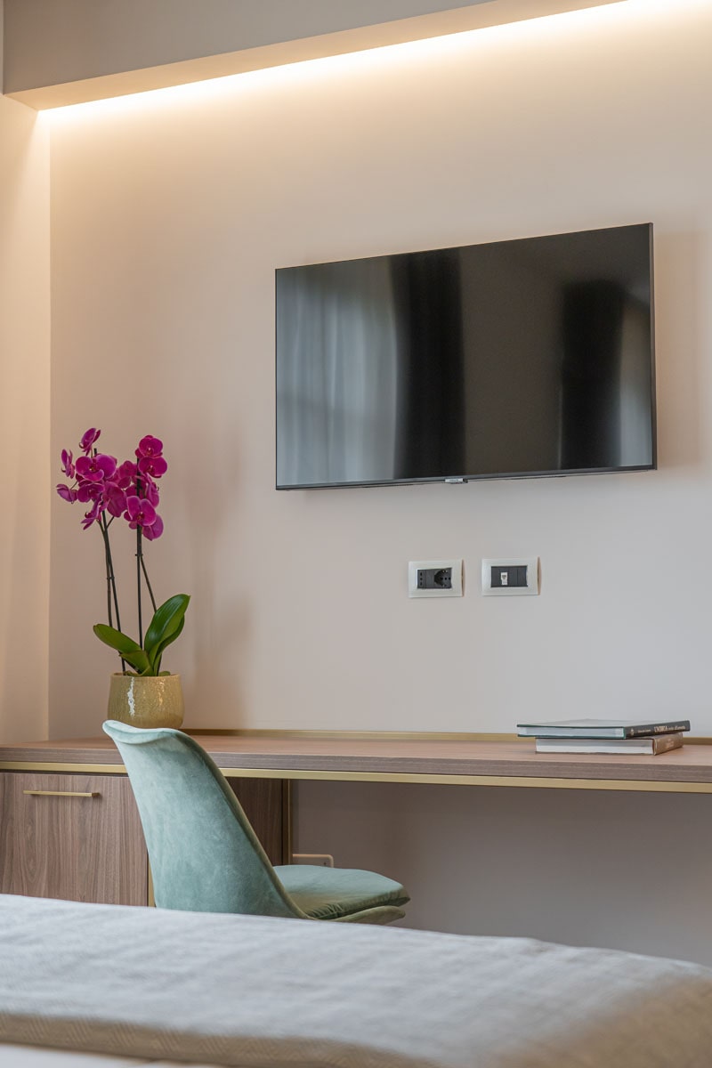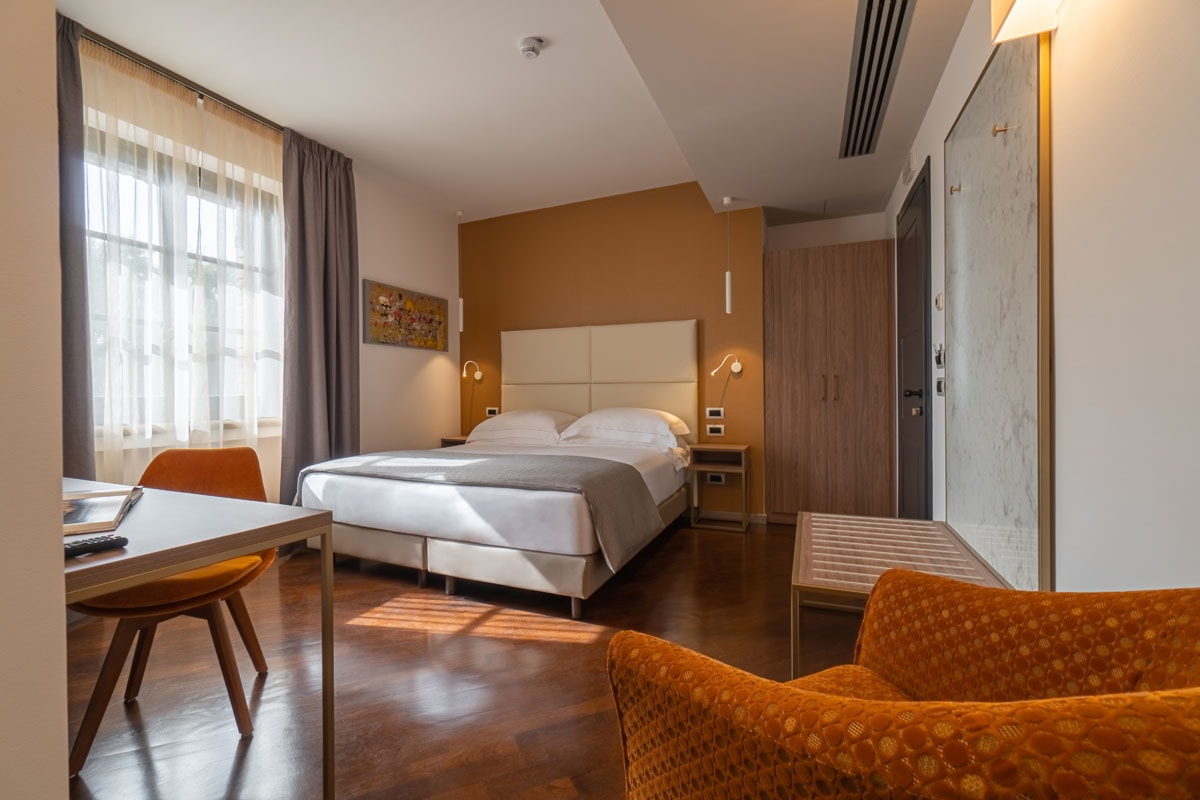 Le due camere Deluxe Torre sono la scelta perfetta per un soggiorno all’insegna del benessere e del relax, grazie ai comodi letti matrimoniali e l’ampia scrivania con bagno con doccia a pioggia e set di cortesia.